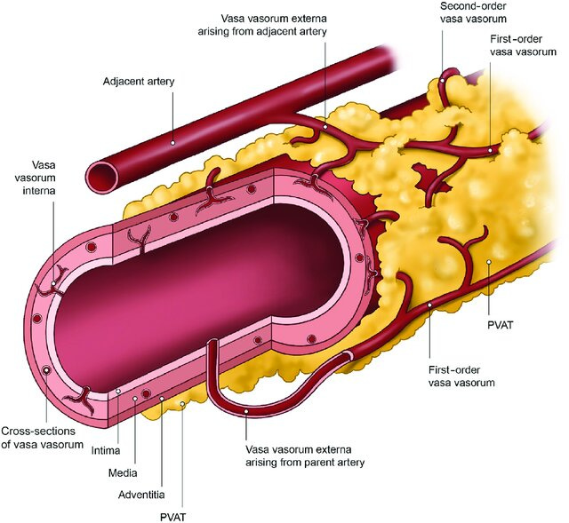 Turns out that all blood vessels have their own capillary blood supply called the vasa vasorum. All vessels have some of this, but the larger ones get their own separate blood vessels that run parallel to it—kinda like service roads. They dump right back into the vessel itself, like a right out driveway.