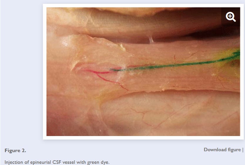 The second system has only come fully to light recently. We’ve long known that the brain and spinal cord float in CSF and debated whether that fluid has its own rhythmic flow patterns. Anyone who has benefitted from a cranial osteopath recognizes they are onto something there. Turns out that circulatory system is far more extensive than we ever dreamed. Doctors at University of Florida (Go Gators!) have now discovered a tiny, primitive CSF system that travels along the outer layers of every single nerve.